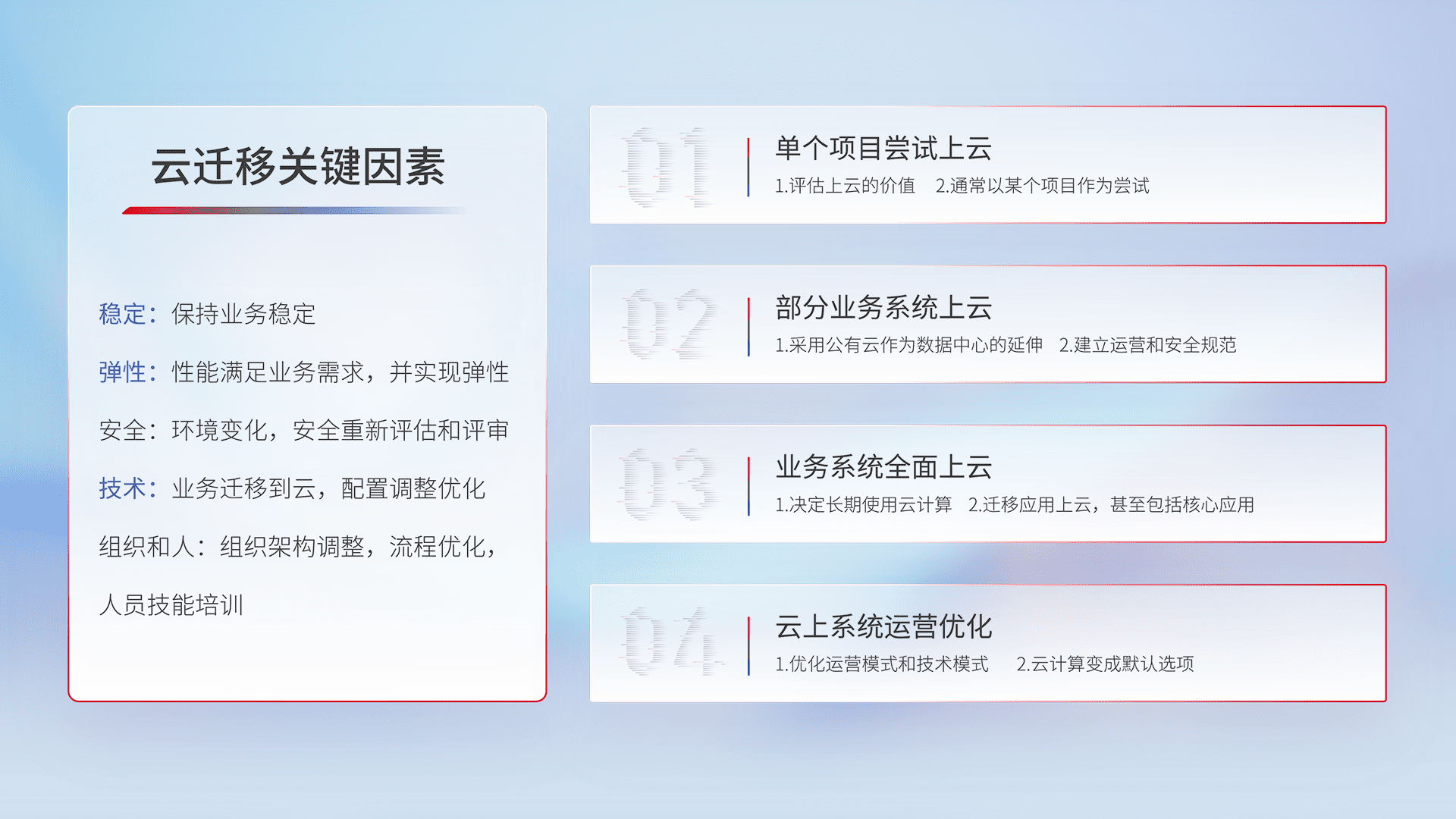 结合实际业务,,,,从规划设计、、、、云平台选型、、云原生改造、、、数据迁移、、、集成交付,,迁移全过程为客户识别最佳上云路径,,,做好风险识别管理,,,,设计网络架构、、、、身份权限、、、、安全审计合规、、、、操作审计、、、日志审计、、监控告警策略、、多站点容灾设计等,,,对云上基础设施进行整体规划,,提升IT治理水平,,以满足弹性、、、、高可用、、、、高性能的需求。。。。