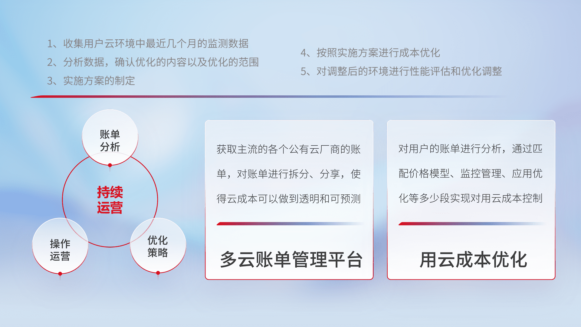 通过多云纳管,,以统一的资源数据模型把客户的云资源进行抽象和封装,,,进而实现对多云资源的统一操作,,,保障云资源管理的可靠性、、、稳定性与可用性。。。量身定制化运维内容,,,配置、、、、开发运维、、补丁管理、、备份、、监控、、、、认证和访问管理、、、审计和日常巡检等,,,,保障在用云过程中的可靠度,,,稳定度以及高可用率。。。。