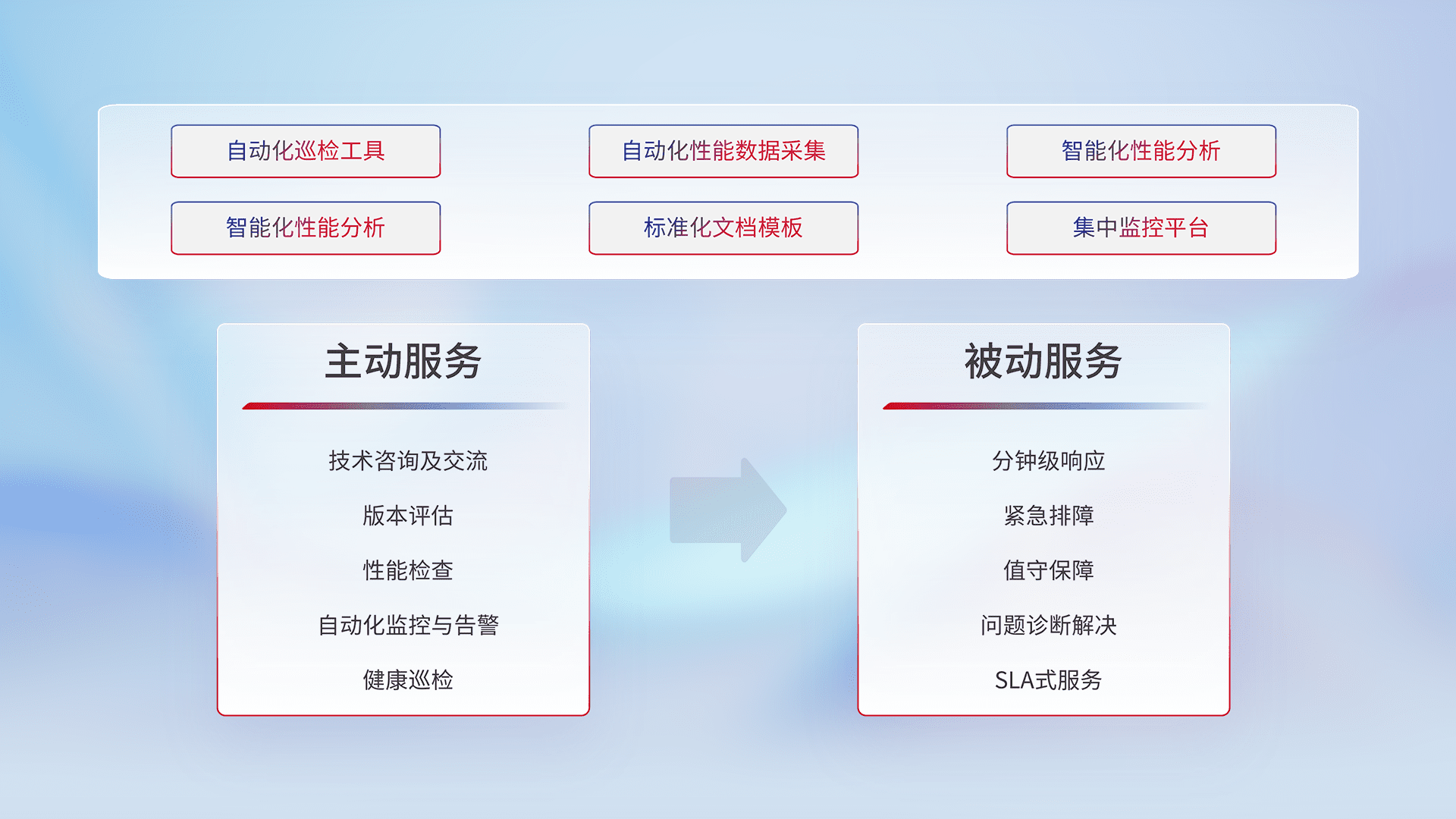 智能化工具和标准化文档,,,保障服务质量,,,提供主动服务(包含技术咨询、、、、版本评估、、、性能检查、、自动化监控与告警、、、健康巡检)和被动服务包含(分钟级响应、、、、紧急排障、、值守保障、、、、问题诊断解决、、、、SLA服务)。。